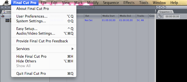 2. To alter the settings, you click on 'Final Cut Pro' and it will be brought up with list of options. You then click on 'System Settings'. If this is the first time you’ve opened 'Final Cut Pro', this window appears automatically after you’ve chosen an 'Easy Setup'. These options will look like the image below.